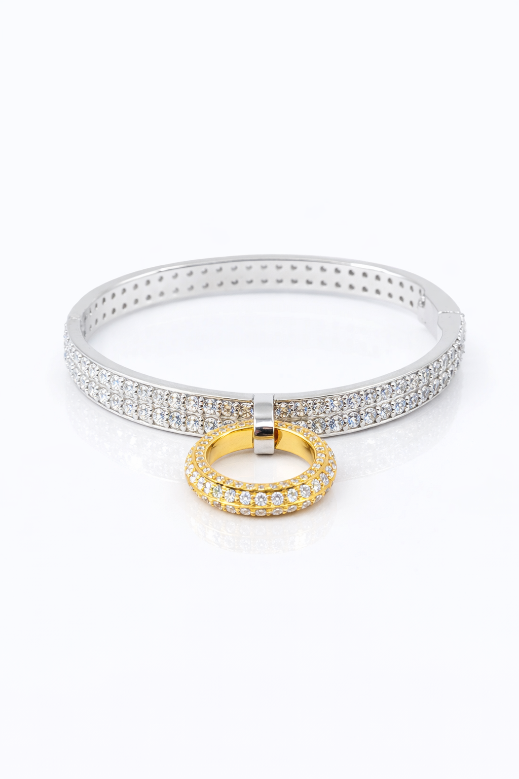 The Circle Of Life Bangle Full Diamond, is crafted in 18k white gold, the circle is made of 18k yellow gold, set with lab-grown diamonds 4.30ct on a size small. The bangle features a hidden safety lock on the side.